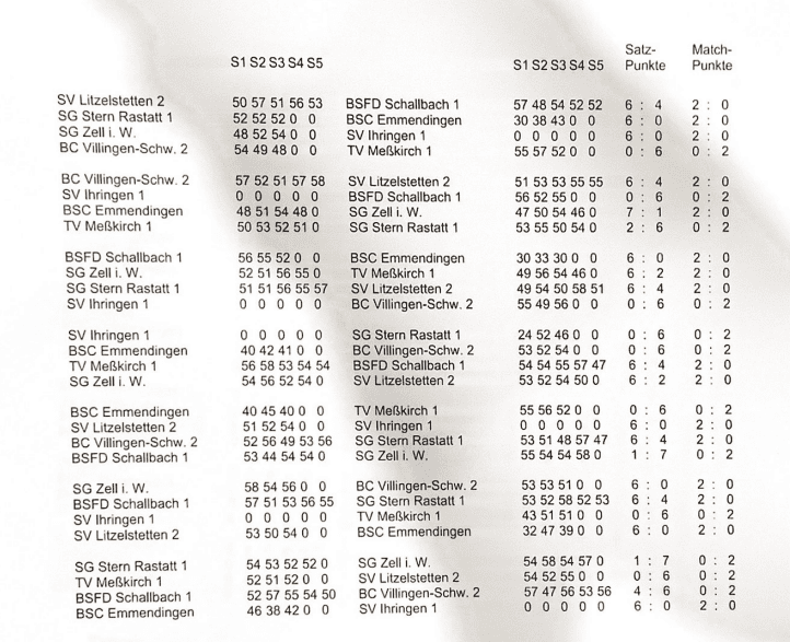 Zum Start haben wir unsere starken Jungs in den Ring geschickt. Björn, Daniel und Matthias haben den Anfang gemacht und haben im großen und ganzen gut Abgeschnitten. Als erstes gegen BSFD Schallbach mit einem 6:4 gewonnen, danach knapp gegen BC Villingen-Schw. und SG Stern Rastatt mit 4:6 verloren. Nachdem sie auch gegen Zell i. W. 2:6 verloren haben, haben sie unsere Schützen, nach der kleinen Pause, mit Stefan und Justin eingetauscht.